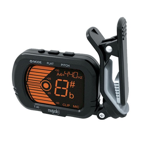 Musedo T-40 - хроматический тюнер-прищепка, новое поколение компактных и простых в использовании тюнеров, от Musedo. Дисплей поворачивается под любым углом, обеспечивая оптимальное положения для настройки гитары. При правильной настройке ноты, дисплей переходит из оранжевого отображение на зелёное, что позволяет ускорить процесс настройки. Дополнительная шкала облегчает настройку в шумной обстановке.
